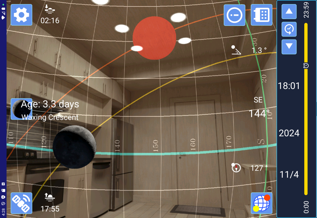 指定した日、時間、場所で実際の方角、高度に「月」を表示します。